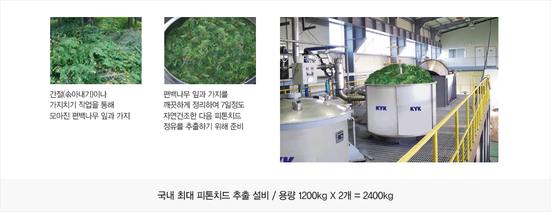 당사는 편백나무를 간벌(솎아내기)하거나 편백나무 가지를 가지치기 작업을 통해서 얻어지는 나무가지와 잎을 모아 천연 피톤치드를 추출합니다.